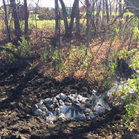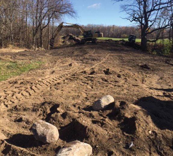 The scope of the project was to meter the water runoff by building an earthen damn with a metered height to create a holding pond for the water to settle in before running into the lake. Many LMA members have had problems with washed out roads, beaches, and driveways due to the runoff. The project will also prevent runoff from the farm fields draining directly into the lake.