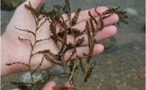Curly-leaf pondweed is a rooted, submersed aquatic plant. Its coloration varies from olive-green to reddish-brown. Wavy, lasagna-like leaves grow approximately a half-inch wide and two to three inches long. Leaves have an obvious mid-vein, “toothed” or serrated edges and blunt tips. Leaves are arranged alternately, are directly attached to the stem, and become denser toward the end of the stem. The main stem can be various colors including white, green, brown, and red, and tends to branch multiple times near the top of the plant. The plant may mat at the surface but does not have true floating leaves.
