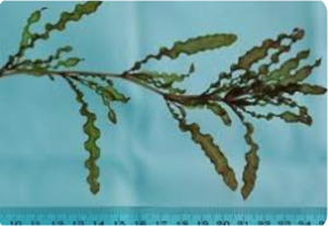 Curly-leaf pondweed is a rooted, submersed aquatic plant. Its coloration varies from olive-green to reddish-brown. Wavy, lasagna-like leaves grow approximately a half-inch wide and two to three inches long. Leaves have an obvious mid-vein, “toothed” or serrated edges and blunt tips. Leaves are arranged alternately, are directly attached to the stem, and become denser toward the end of the stem. The main stem can be various colors including white, green, brown, and red, and tends to branch multiple times near the top of the plant. The plant may mat at the surface but does not have true floating leaves.